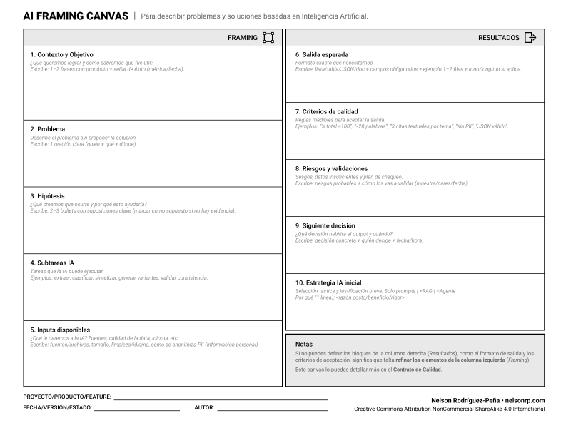Herramientas como el AI Framing Canvas ayudan a ordenar el problema: objetivo, insumos, riesgos, restricciones y tipos de tareas donde la IA aporta valor. Ese orden inicial evita la clásica dinámica de “usar IA para ver qué pasa” y transforma un desafío difuso en pasos claros, verificables y alineados con decisiones del negocio.